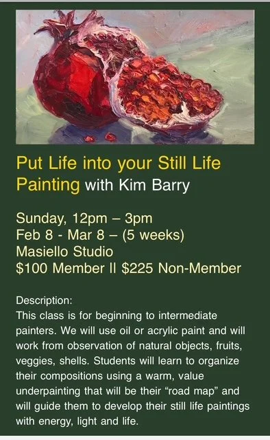 February 8th to March 8th I will teach a Still Life Painting class on Siundays 12:00 - 3:00